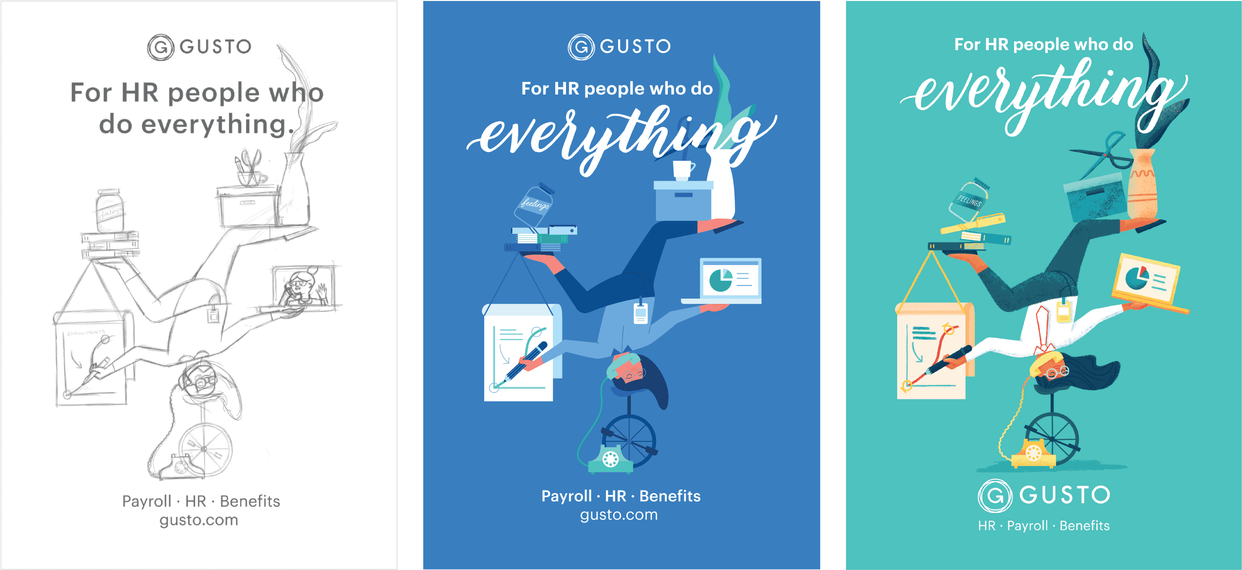 Camellia: We were developing the ads in time for Dreamforce, so at the time we were thinking about how Gusto could stand out in a sea of 200,000 attendees. Illustration and lettering is a visual language and combination that set us apart from our incumbents.