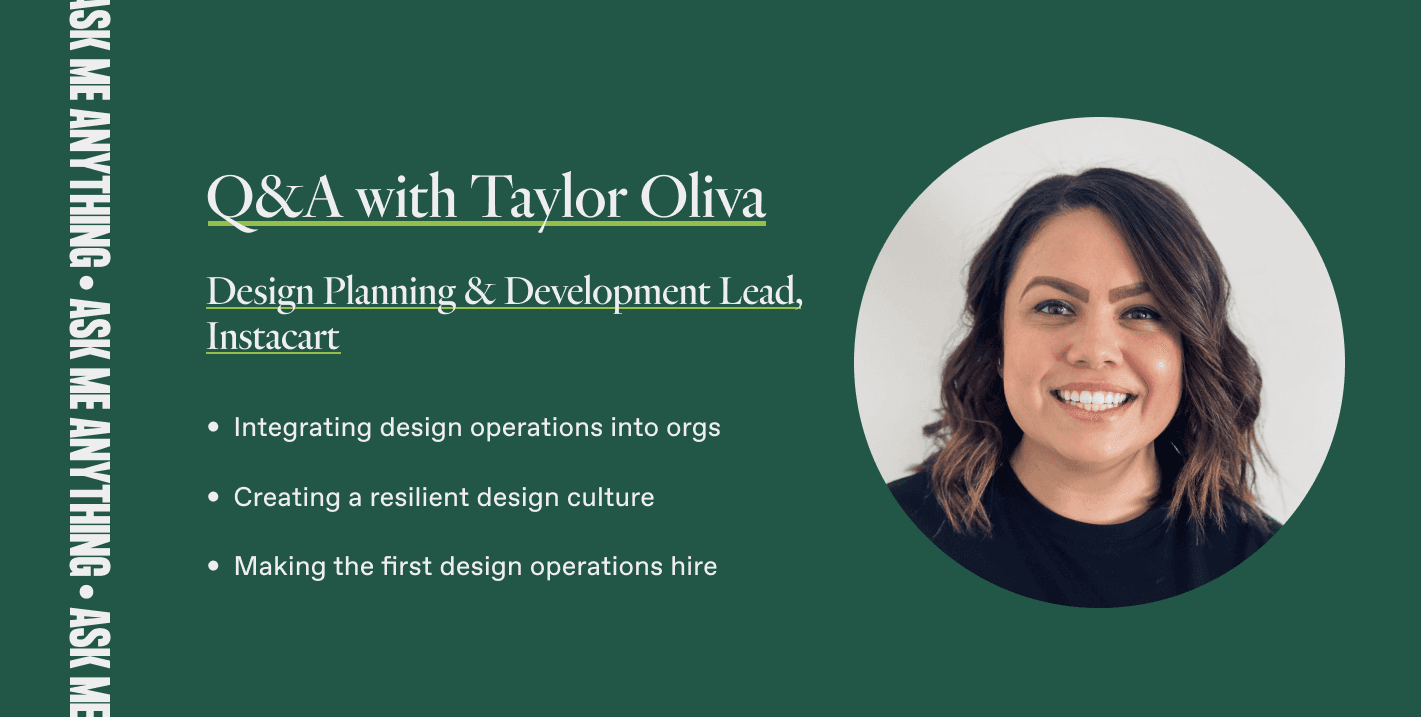 Taylor Oliva is something of a design operations powerhouse, having scaled Instacart’s design and research operations team as its Head of Design and Research Operations, working at Thumbtack as its first design program manager, and teaching design operations professionals as a DesignOps Assembly Learning Labs instructor. At Instacart, Taylor currently works with the Design and Research leadership team to identify and operationalize the organization's highest priority programs across people, processes, and products, with a focus on optimizing quality and enabling great work.