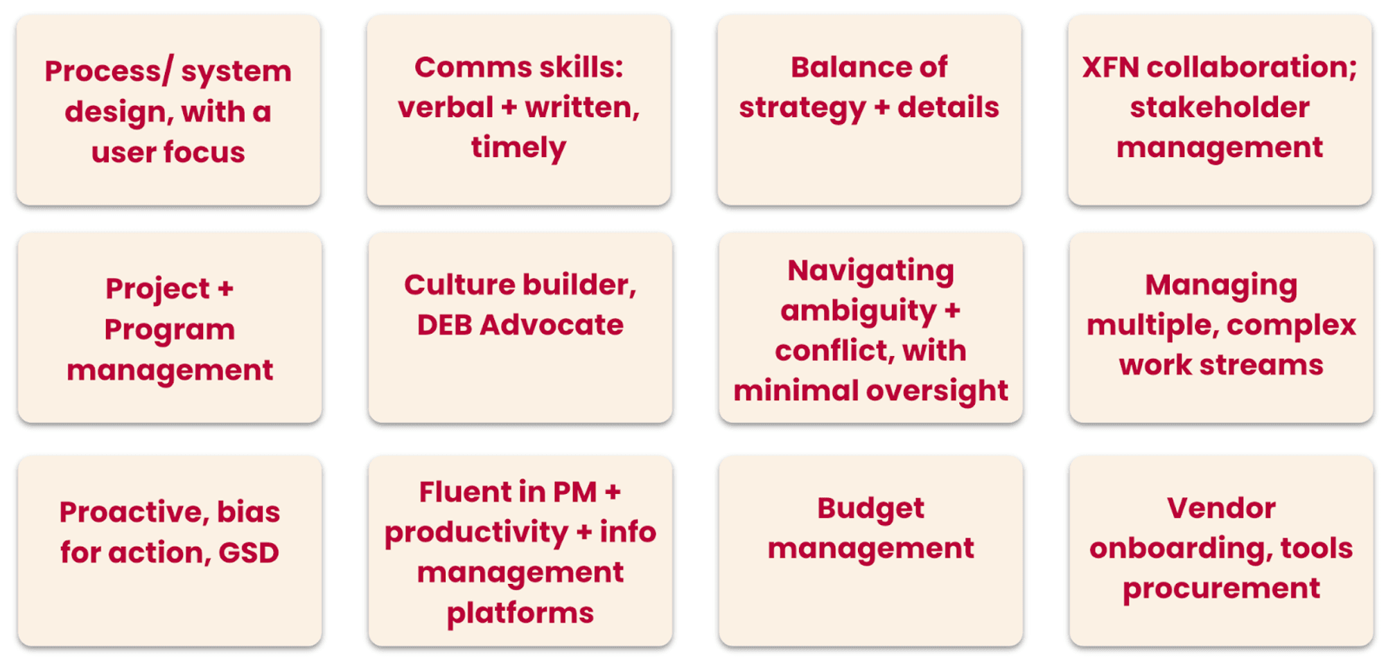 Great DesignOps practitioners come from all backgrounds, but there is a core skillset that will help make them successful in the role. Here are a few that are commonly included in DesignOps job descriptions: