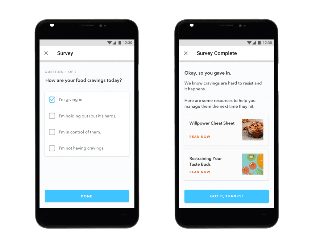 Your behavior change product should constantly be capturing feedback, both passively (through user interactions) and actively (surveys and ratings). Based on this feedback, your system should be able to (1) identify the type of user and their unique needs, (2) determine the right content or tool from a variety of available options, and (3) deliver the experience or content that is most helpful, given their needs. Step 3 can be done via basic, hard-coded logic (“if user inputs this, then deliver this piece of content”), or a sophisticated, machine learning model.