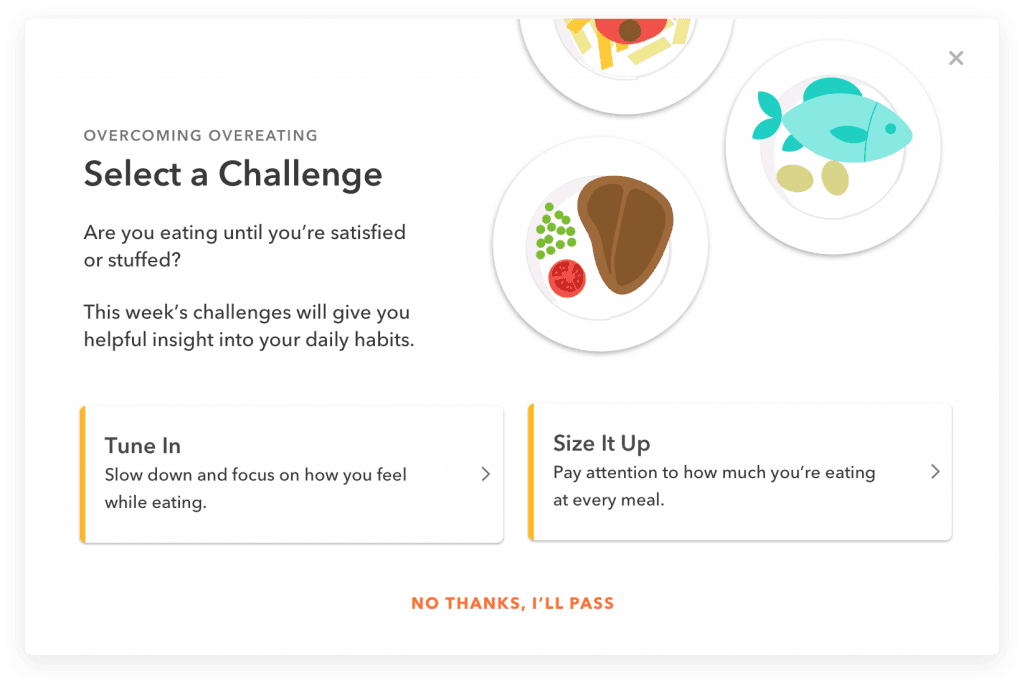 Offering a choice of 2 challenges invites the user to pick their own path, which helps build the self-efficacy necessary for long-term behavior change. Options are determined by a machine learning model that identifies which challenges are best for this user at this time.