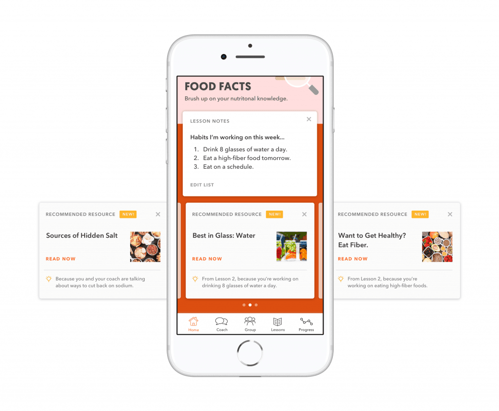 Similarly, when we know users are working on new habits, we provide additional educational resources to help them implement changes. The system identifies the top 2-3 resources for the user based on the habits they’re working on and relevance to users like them.