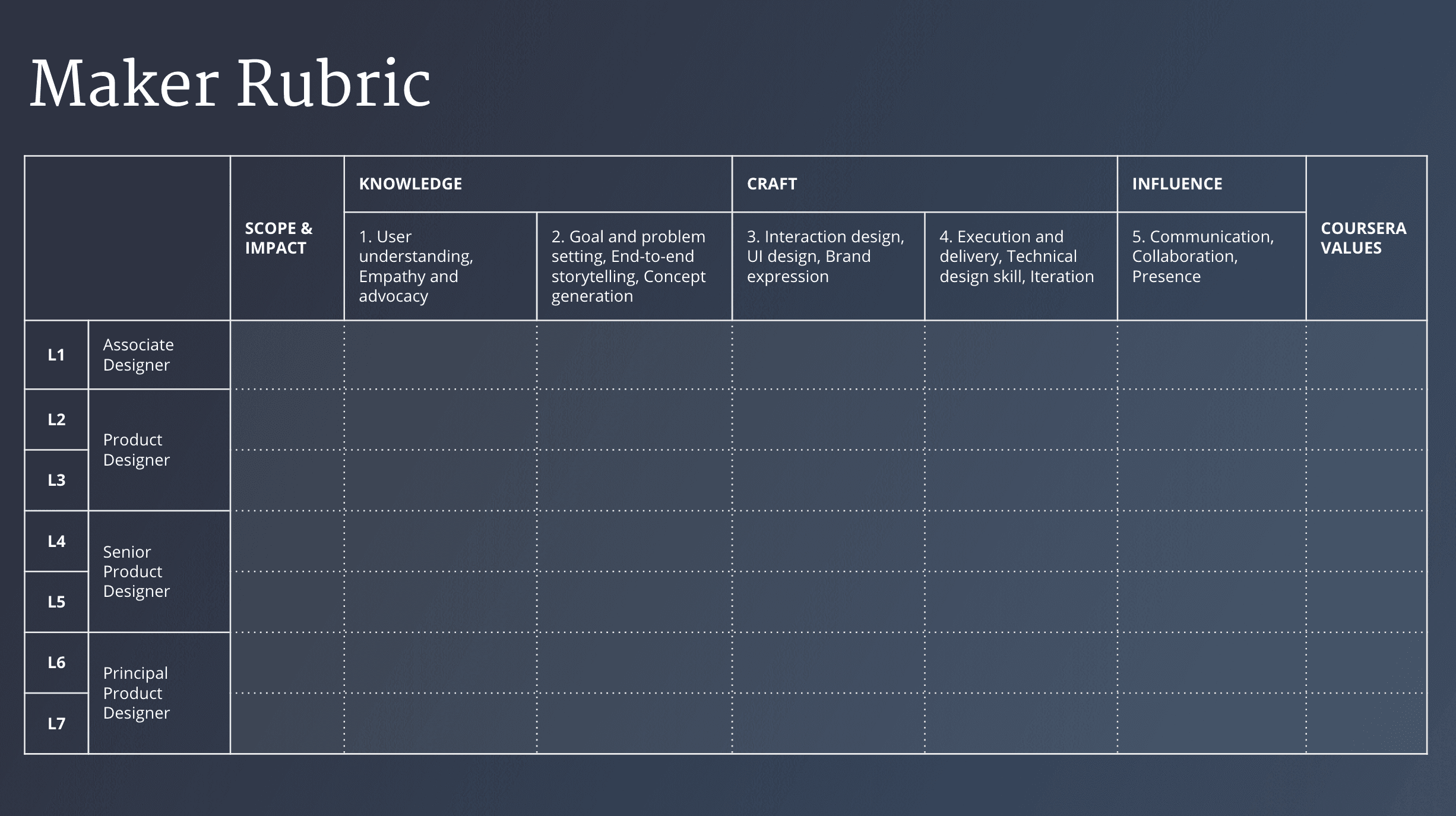In the rubric below for Makers in product design, there are 7 levels running down the left-hand side. Levels are accompanied by a title, and two levels are sometimes grouped into the same one. Across the top, there are 5 focus areas that Coursera’s design team prioritizes, such as “User understanding, empathy, and advocacy,” organized by theme. There is a special 6th column dedicated to a focus on Coursera values, which are “Betterment, Deep Honesty, Boldness, and Solidarity.”