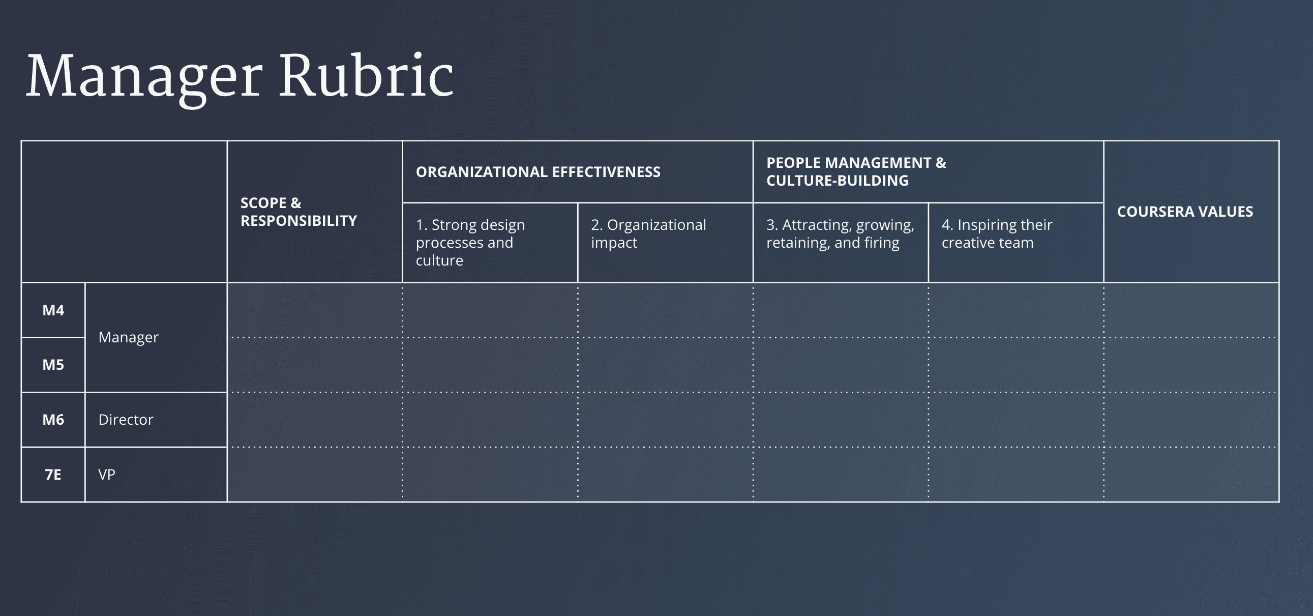 Coursera recently underwent their first official company-wide leveling process and used the following rubric structures as frameworks for their level descriptions.