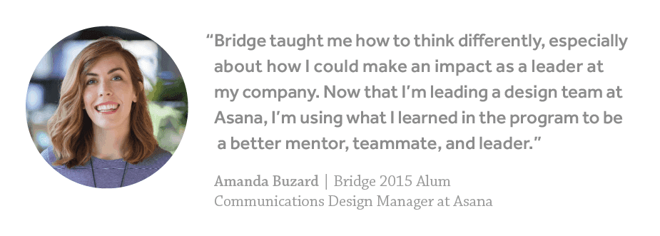 Most designers participate in Bridge by interviewing and accepting a new full-time role at one of our partner companies. If you’re looking for a new role, we facilitate the process with one simple, common application that’s visible to all our hiring partners. If you want to stay and grow as a leader at your current company, you can still apply to participate in a program using the same application process.