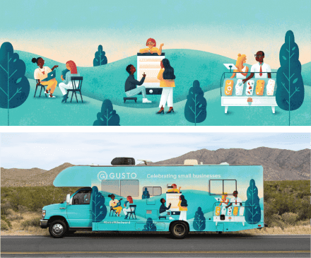 Camellia: Mostly because of the wonderful Heather Phillips at Designer Fund. She had hired me as a brand designer at a company called RelateIQ and once she moved on to Designer Fund, we kept in contact. She had encouraged me to apply to Bridge in the past and when Gusto started looking for a designer with an illustration background, everything fell into place. I feel pretty lucky.