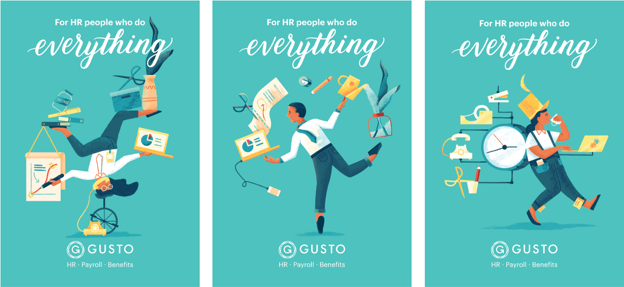 Camellia: We were developing the ads in time for Dreamforce, so at the time we were thinking about how Gusto could stand out in a sea of 200,000 attendees. Illustration and lettering is a visual language and combination that set us apart from our incumbents.