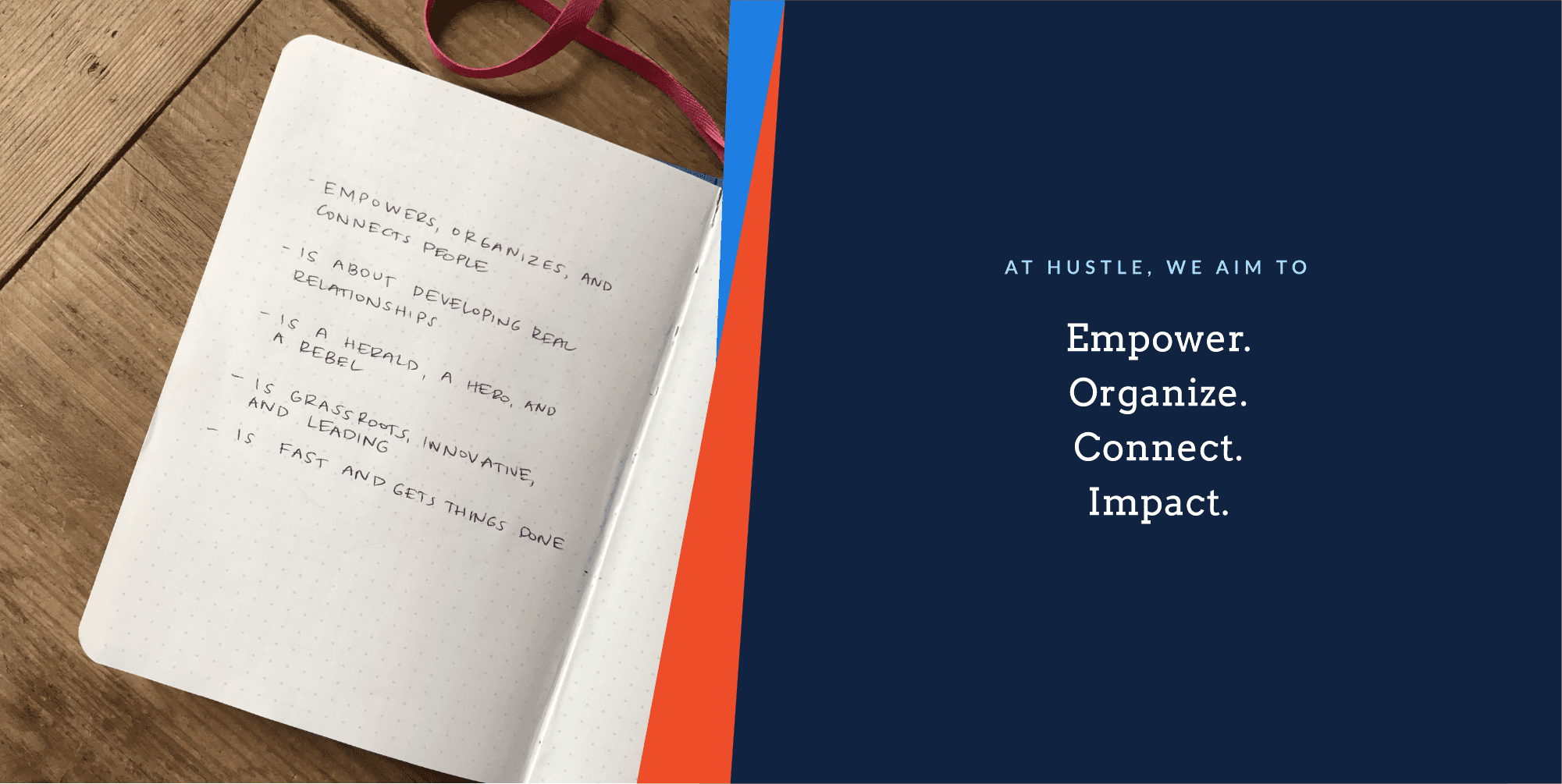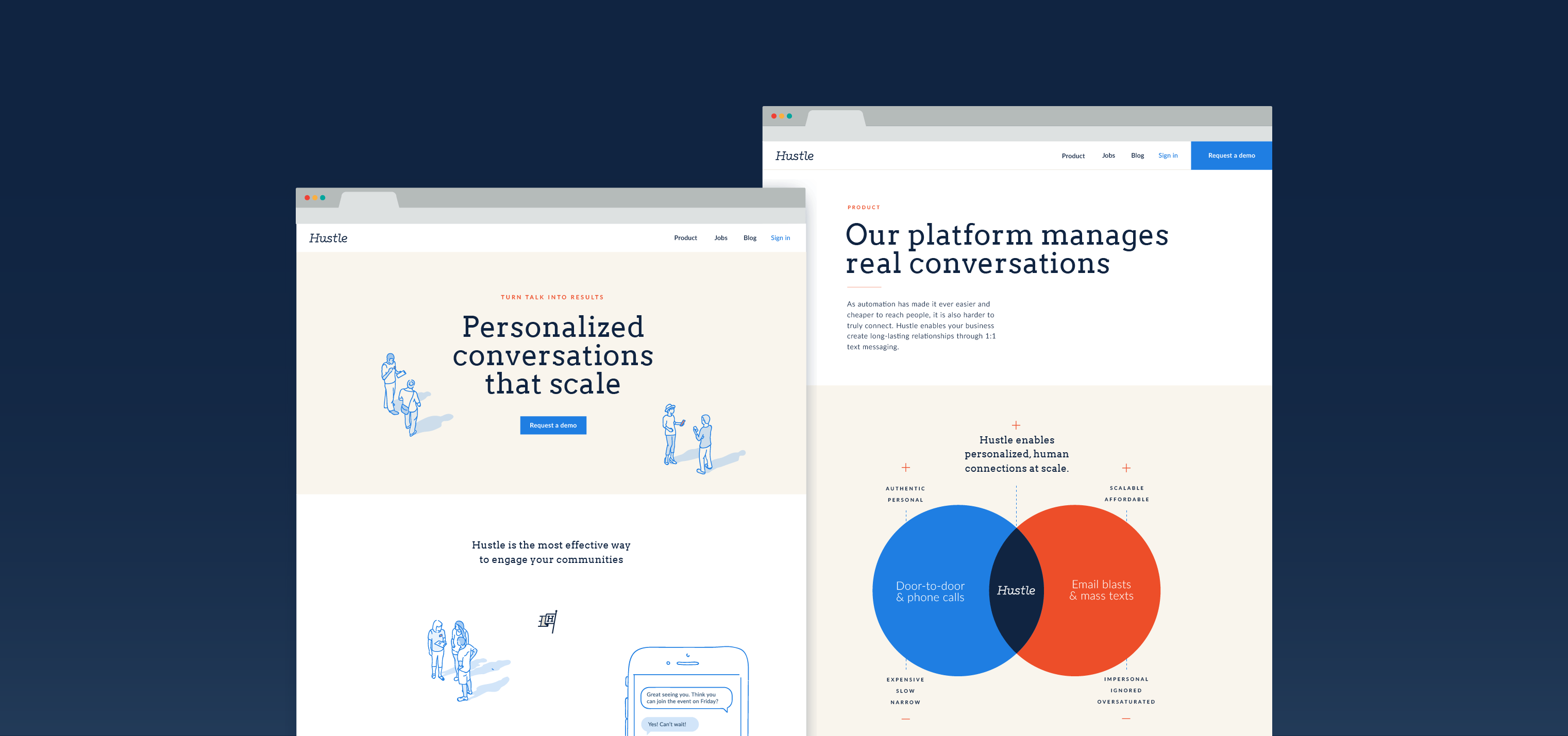 Roddy: We had several different goals, which made this a challenging redesign. First, we wanted to evoke the breadth of the product and brand…that Hustle is a tool that can be used by many different people and types of organizations to achieve their goals. Second, we wanted to connect both the human and informal element of the product—that Hustle connects real people to have authentic dialogues about important topic—with its impact-driven, results-oriented, lets-get-stuff-done qualities. That called for brand elements that evoked togetherness as well as impact.