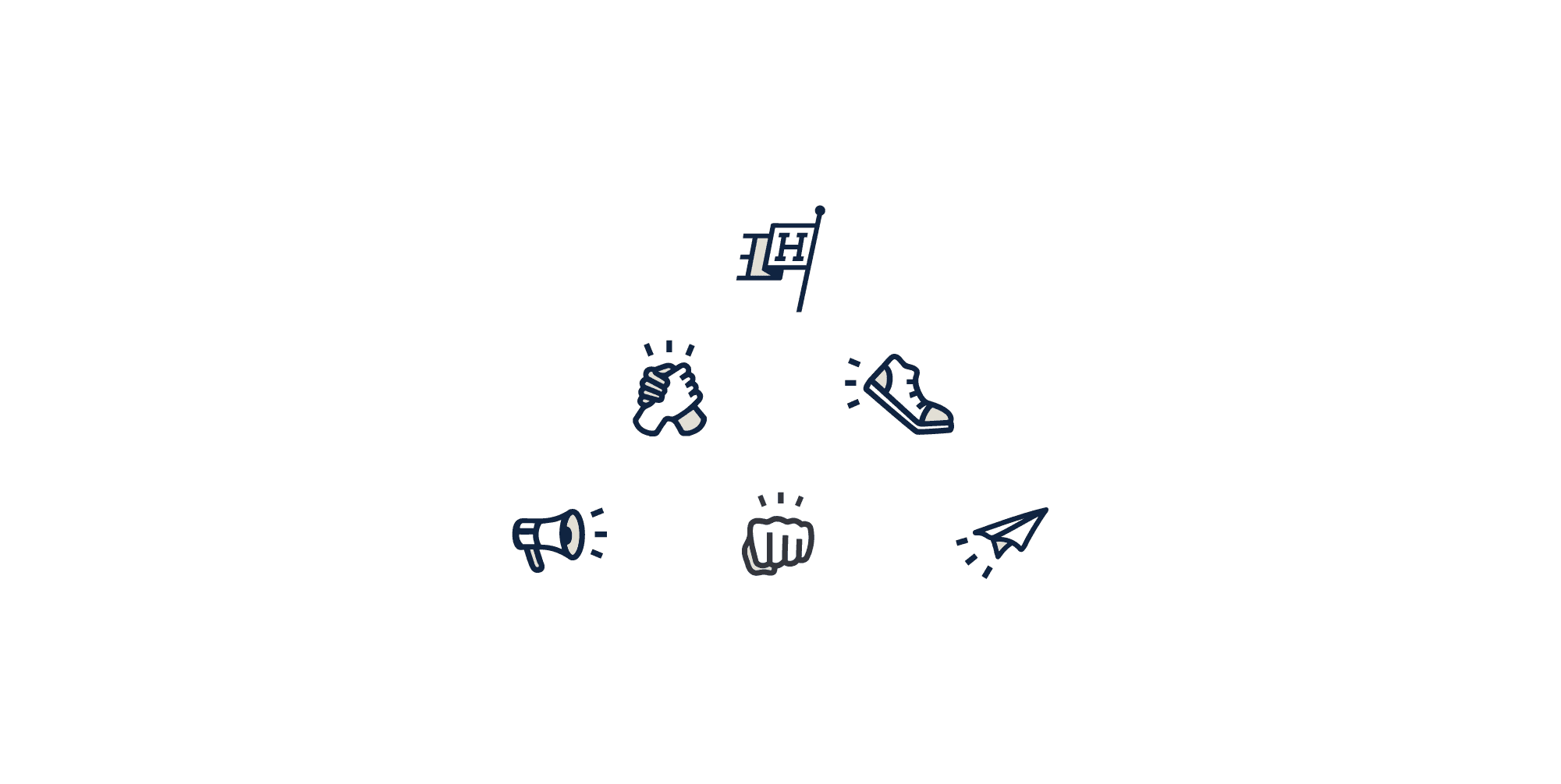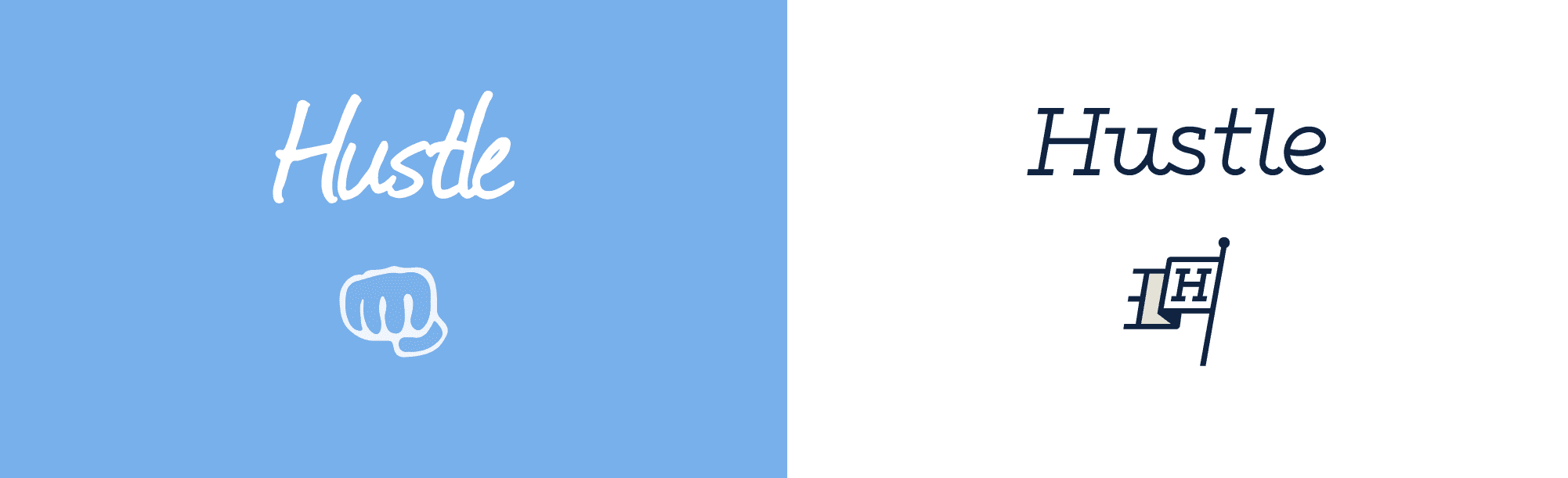 When it came to the mark, the fist icon was such a powerful visual that I struggled to change it. I also loved the story behind it — (Roddy & Perry used it in their first iterations of the platform to differentiate a Hustle message from a regular text). Unfortunately, the fist comes with a fair amount of meaning (defiance, resistance) that the already rebellious company name didn’t need. I felt the flag really embodied all of the qualities of the brand — empowering, aspirational, moving forward, carrying a message… I started tinkering around with that idea and developed the final flag mark out of the H in the logotype.