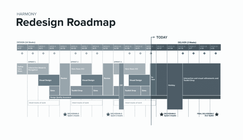 Below is an example of a project plan that the design team used at Intuit when redesigning QuickBooks. This let people know when interim decisions were being made along the way and when a decision was closed for discussion so that we could move forward and meet our overall deadline.