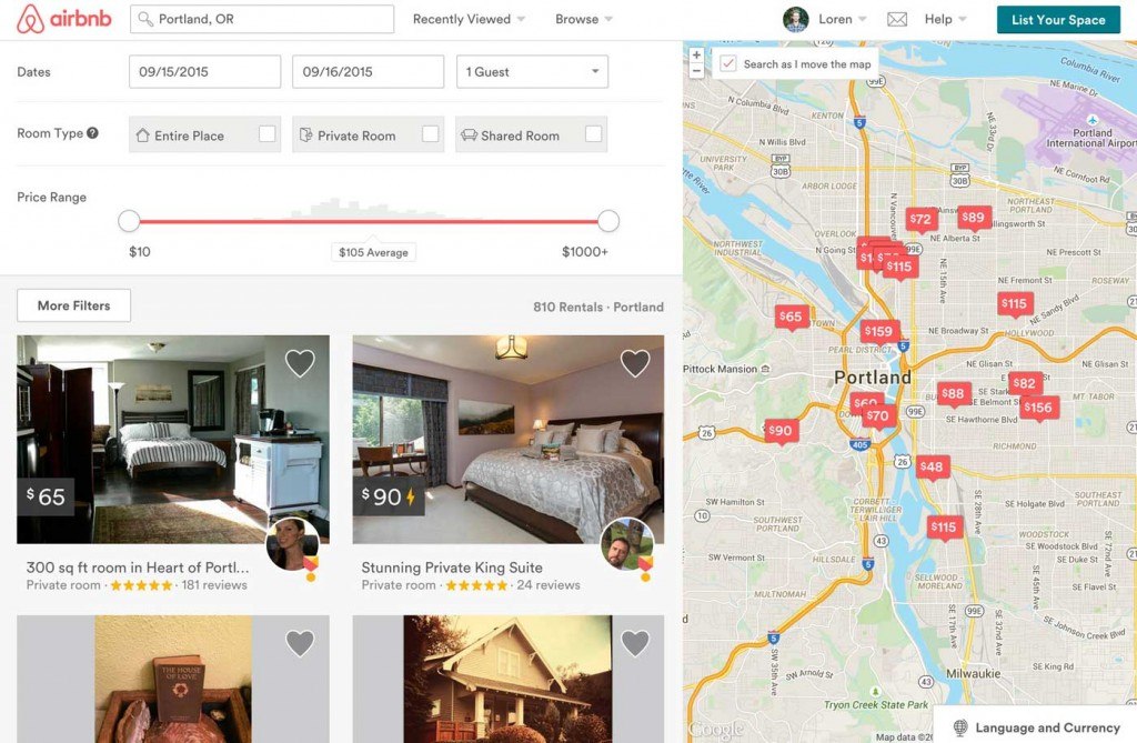 In contrast, Airbnb’s search results page includes photos as listing results in a grid. They are still important, but much less so, living comfortably alongside other pieces of UI and content.