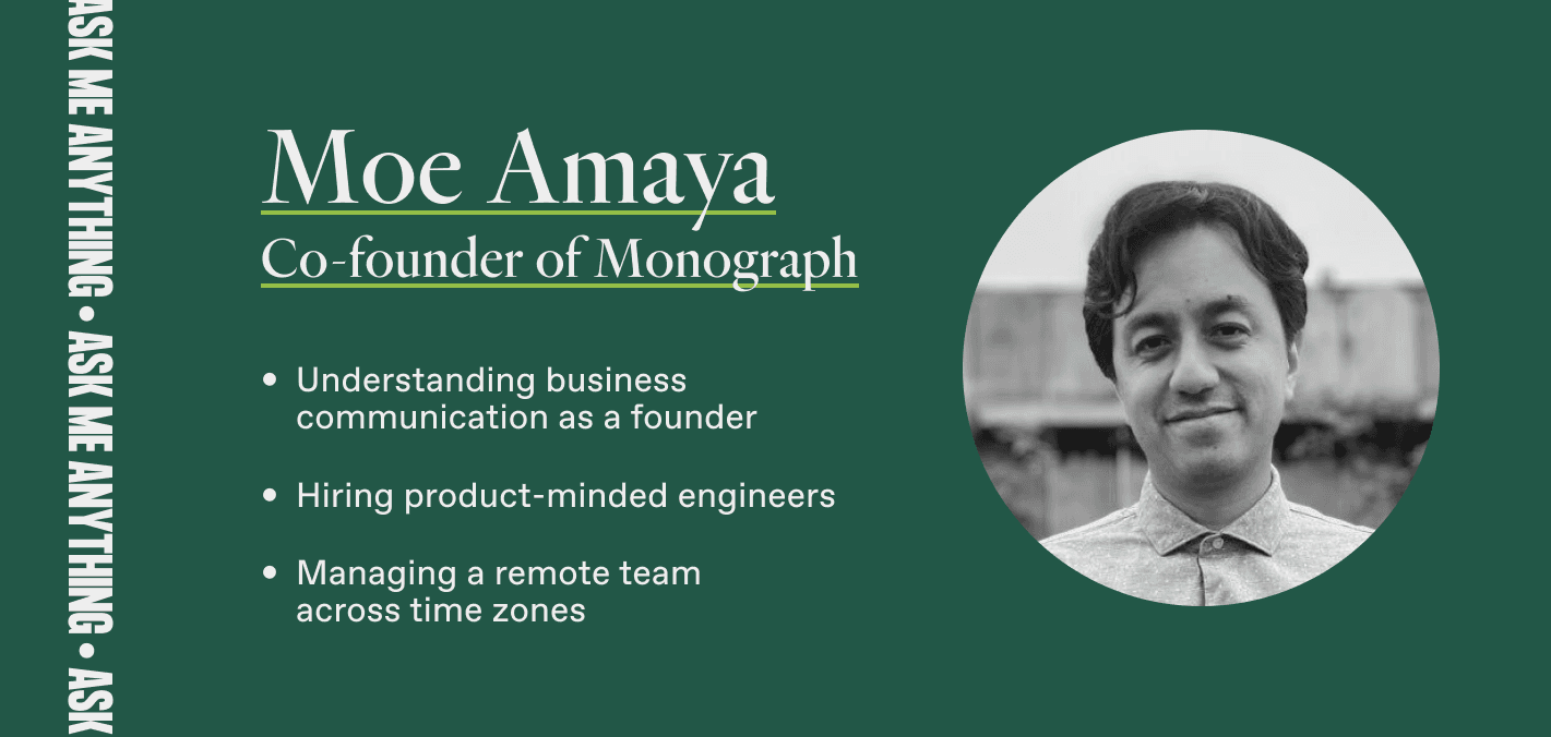 Now at Monograph, Moe is putting all his learnings into practice in leading both engineering and creative direction at the 50-person company. He recently joined the Designer Fund Collective community for an AMA (Ask Me Anything), looking back on his path as a designer-founder and sharing a few of the early-stage hiring tactics that remain in use today, advice on bridging the trust gap between design and engineering teams, and the impact of his personal brand on building a startup.