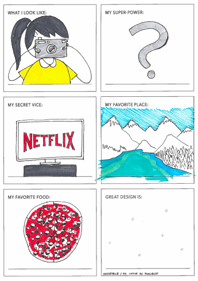 When we onboard designers, we ask them to sketch a bit about themselves: their favorite food, their secret vice, their superpower, what they believe great design to be.